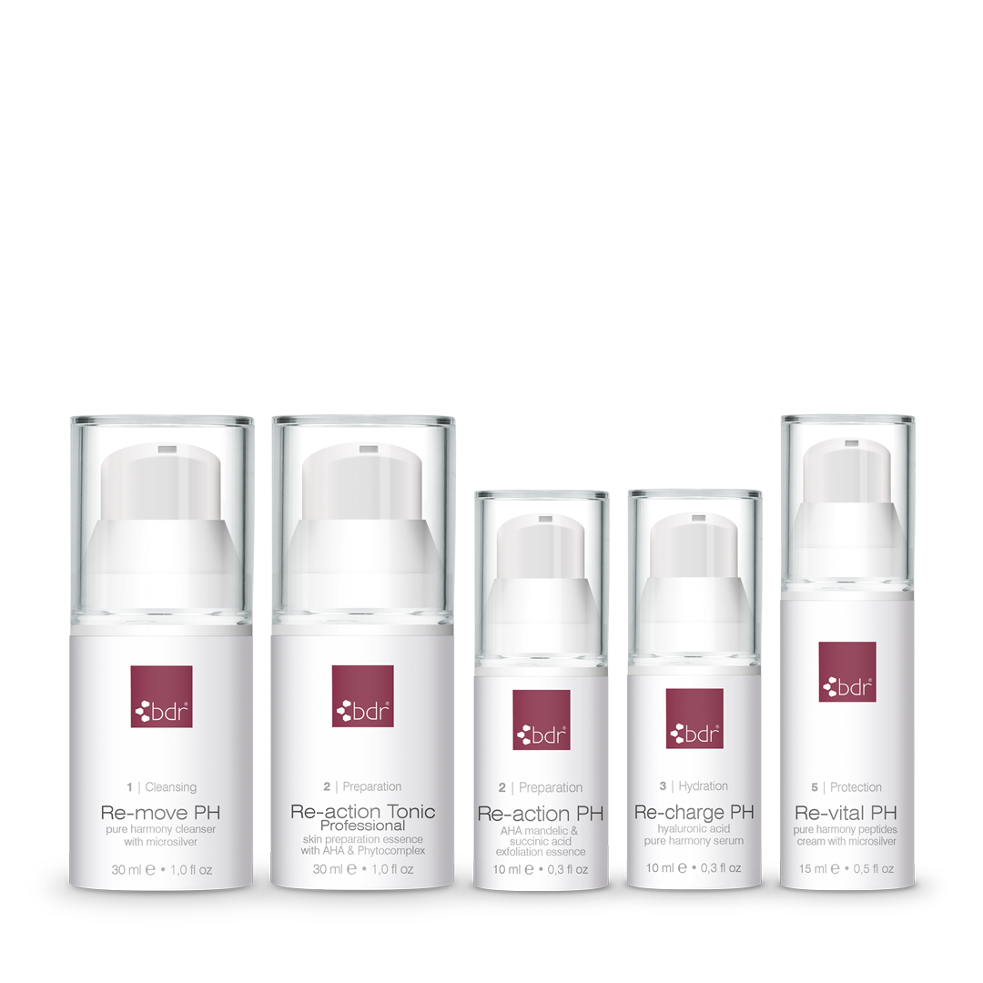 Inhalt Re-move PH 30 ml, Re-action tonic professional 30 ml, Re-action PH 10ml, Re-charge PH 10ml & Re-vital PH 15ml